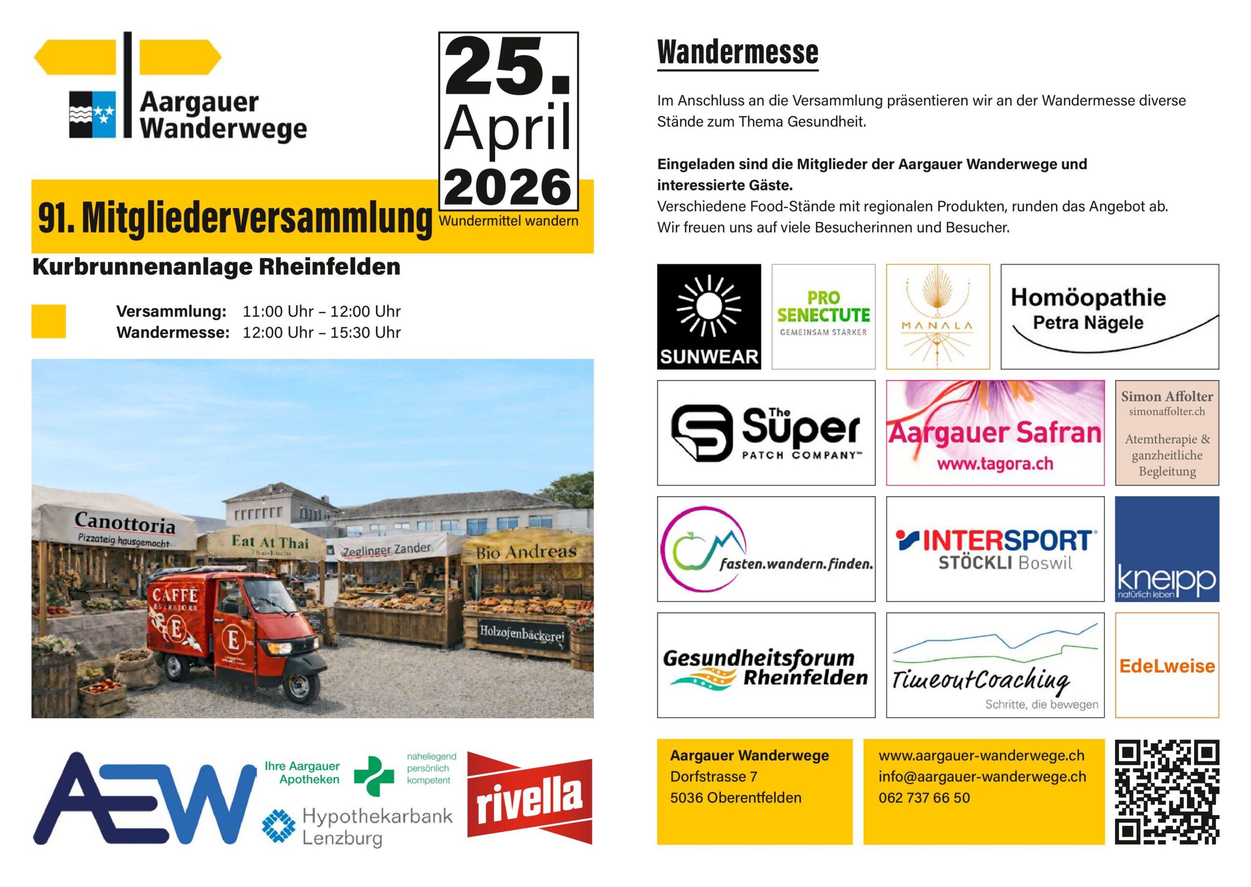 Am 25. April 2026 findet in der Kurbrunnenanlage in Rheinfelden von 11 bis 12 Uhr die Mitgliederversammlung statt. Von 12 bis 15.30 Uhr haben Sie die Möglichkeit an der Wandermesse die verschiedenen Stände zum Thema Gesundheit zu besuchen.  Die Aargauer Apotheken sind auch mit einem Stand vertreten. Wir freuen uns auf Ihren Besuch.
